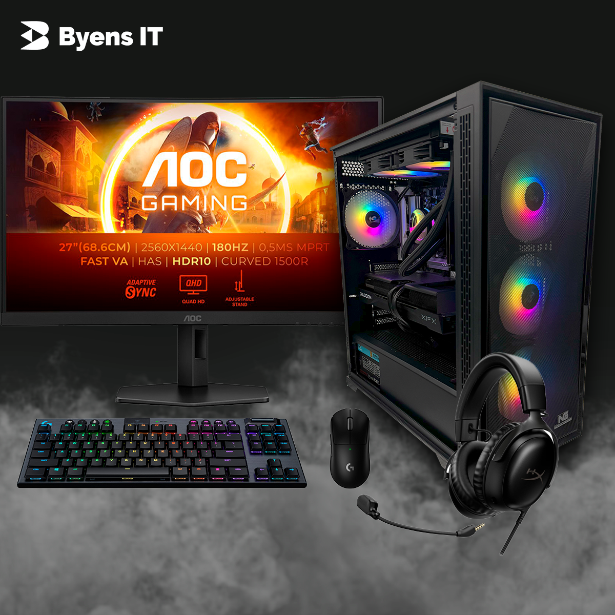 Som en del af gamer-pakken medfølger HyperX Cloud III headset, AOC 27″ Fast gaming-skærm, Logitech G915 TKL tastatur og Logitech G PRO X Superlight mus. Alt udstyr er valgt til konkurrencepræget gaming med fokus på lav latency, høj komfort og præcision.