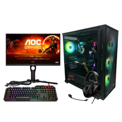 Som del af pakken medfølger skærm og gaming-udstyr, så du har alt det nødvendige til at komme i gang med det samme: skærm, mekanisk tastatur, gaming-mus og headset.