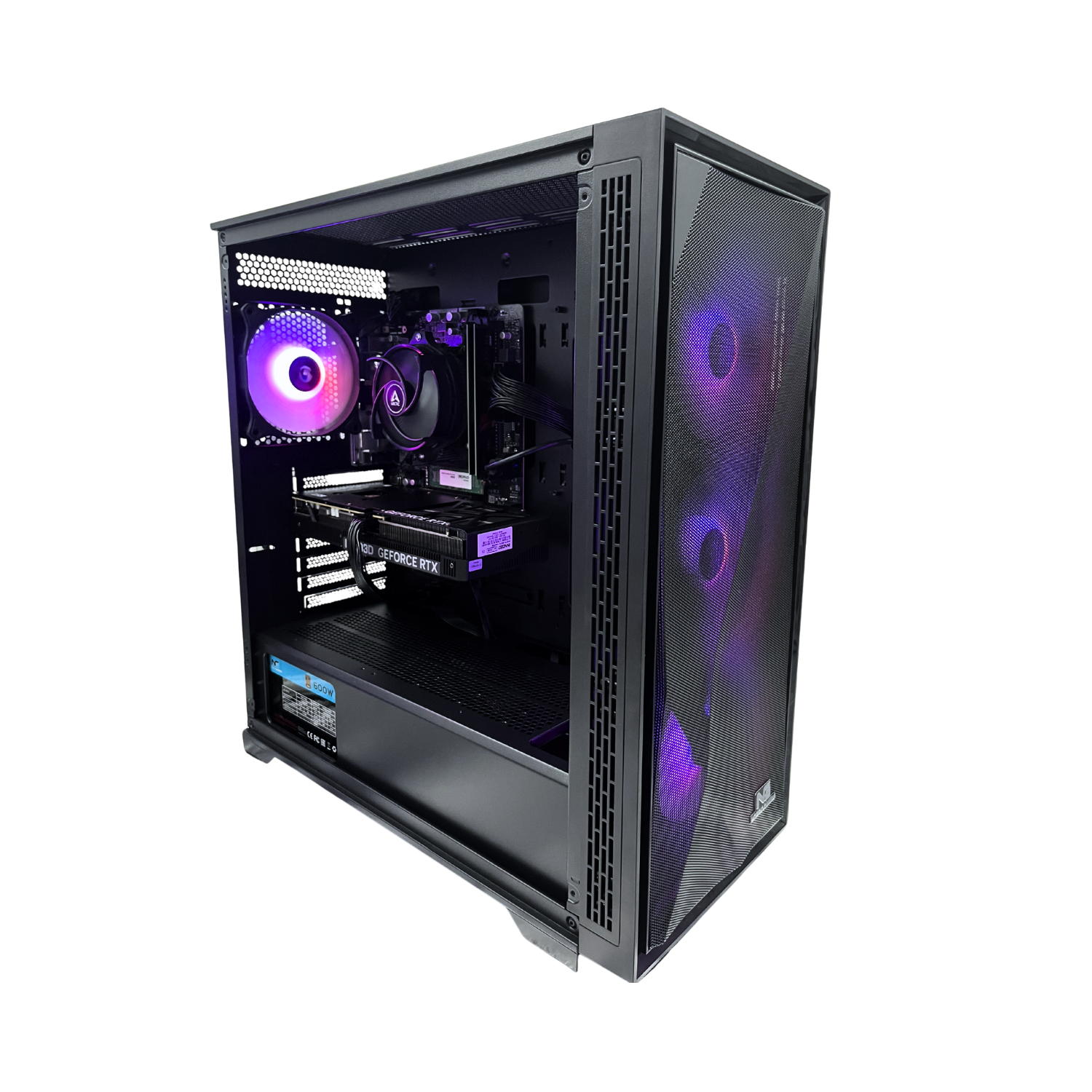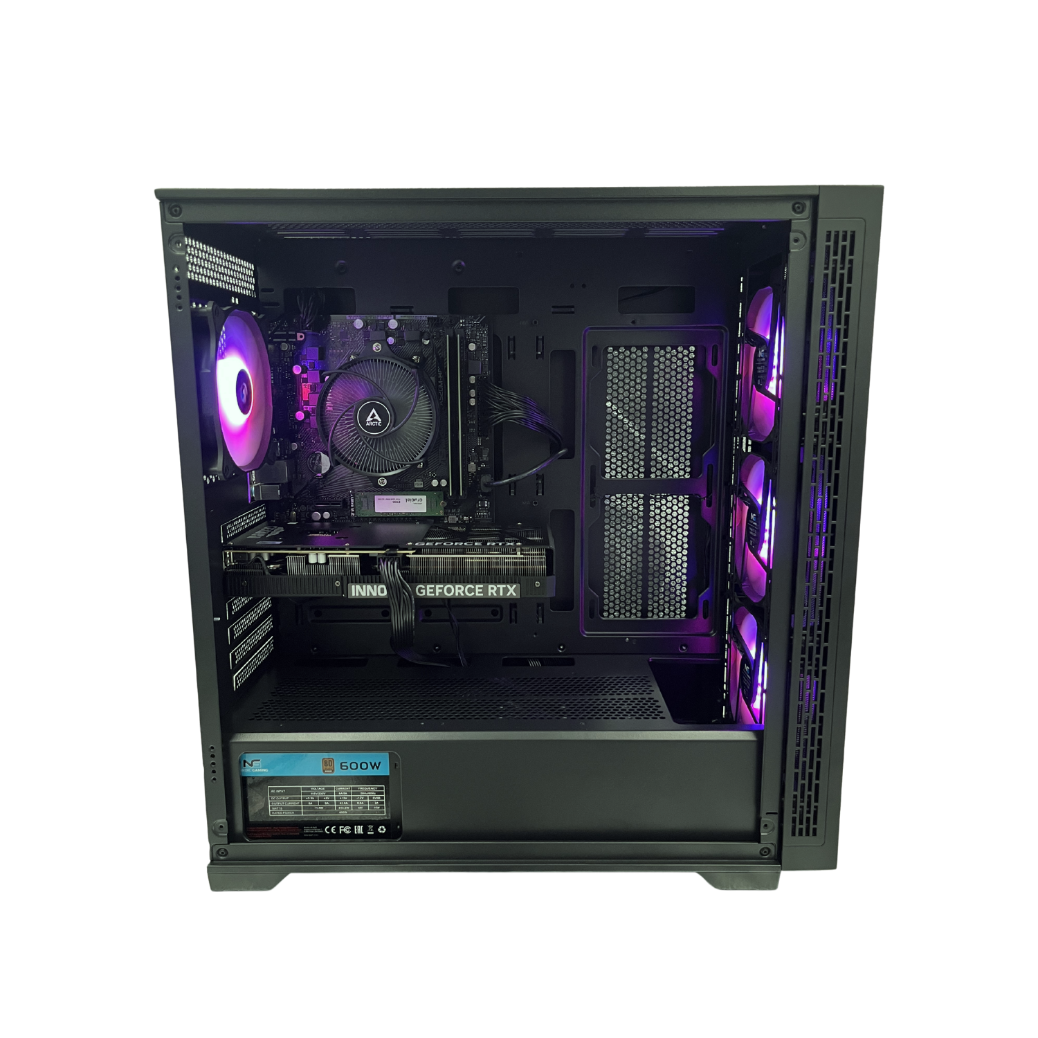 Det hele er samlet i et Nordic Gaming Nidhug RGB Tower kabinet med RGB-styring via Nordic Gaming RGB100 aRGB controller, og strøm leveres af en Nordic Gaming NGP-1174 600W 80+ Bronze strømforsyning.